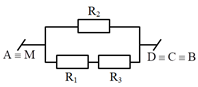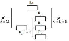 Cho mạch điện như hình vẽ. Biết \({R_1} = {R_5} = 6\,\,\Omega ;\,\,{R_2} = {R_4} = 3\,\,\Omega ;\,\,{R_3} =