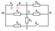 Cho mạch điện như hình vẽ. Biết \({R_1} = {R_5} = 6\,\,\Omega ;\,\,{R_2} = {R_4} = 3\,\,\Omega ;\,\,{R_3} = 2\,\,\Omega \). Tính điện trở tương đương của mạch điện khi K đóng, K mở.