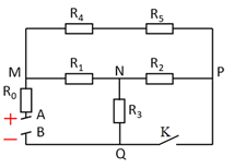 Cho mạch điện như hình vẽ. Biết \({R_0} = 5\,\,\Omega ;\,\,{R_1} = 6\,\,\Omega ;\,\,{R_2} = 18\,\,\Omega ;\,\,{R_3} = {R_5} = 9\,\,\Omega ;\,\,{R_4} = 3\,\,\Omega \). Tính điện trở tương đương của mạch điện khi K đóng, K mở.