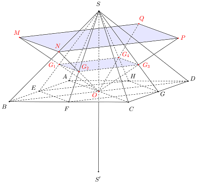 Cho hình chóp đều \(S.ABCD\) có cạnh đáy bằng \(a\), cạnh bên bằng \(2a\) và \(O\) là tâm của đáy. Gọi \(M\),\(N\), \(P\), \(Q\) lần lượt là các điểm đối xứng với \(O\) qua trọng tâm của các tam giác \(SAB\), \(SBC\), \(SCD\), \(SDA\) và \(S'\) là điểm đối xứng với \(S\) qua \(O\). Thể tích của khối chóp \(S'.MNPQ\) bằng