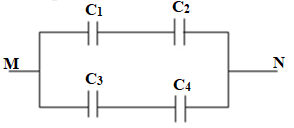 Bốn tụ điện được mắc thành bộ theo sơ đồ dưới. \({C_1}\; = 1\mu F;{C_2}\; = 3\mu F;{C_3}\; = 3\mu F\). Khi nối hai điểm M, N với nguồn điện thì tụ điện \({C_1}\) có điện tích \({Q_1}\; = 6\mu C\) và cả bộ tụ điện có điện tích \(Q = 15,6\mu F\) . Tính hiệu điện thế đặt vào bộ tụ điện?