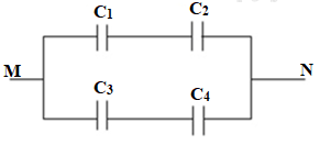 Bốn tụ điện được mắc thành bộ theo sơ đồ dưới. \({C_1}\; = 1\mu F;{C_2}\; = 3\mu F;{C_3}\; = 3\mu F\). Khi nối hai điểm M, N với nguồn điện thì tụ điện \({C_1}\) có điện tích \({Q_1}\; = 6\mu C\) và cả bộ tụ điện có điện tích \(Q = 15,6\mu C\) . Điện dung C4 bằng?