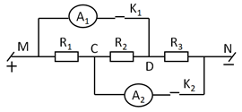 Cho mạch điện như hình vẽ. Biết \({R_1} = {R_2} = 12\Omega ;\,\,{R_3} = 6\Omega \). Tính điện trở tương đương \(R_{MN}\) khi \(K_1\) và \(K_2\) đều đóng ?