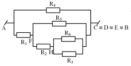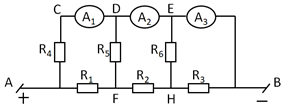 Mạch như hình vẽ. Biết \({R_1} = {R_4} = {R_5} = 10\Omega ;\,\,{R_2} = {R_3} = 6\Omega ;\,\,{R_6} = 12\Omega \) . Điện trở các Ampe kế không đáng kể. Tính \(R_{AB}?\)