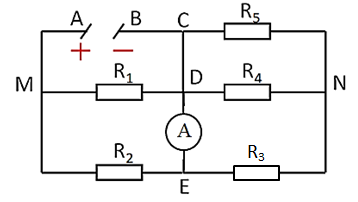 Cho mạch điện như hình vẽ. Biết \({R_1} = {R_5} = 6\,\,\Omega ;\,\,{R_2} = {R_4} = 3\,\,\Omega ;\,\,{R_3} = 2\,\,\Omega \). Ampe kế có điện trở không đáng kể. Tính \({R_{AB}}\).