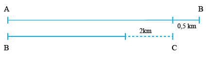 Một đoàn học sinh đi từ A đến B qua địa điểm C để cắm trại. Sau khi đi đoạn AB mất 2 giờ 30 phút thì họ tăng vận tốc thêm mỗi giờ 1km để đến C đúng giờ quy định. Tính quãng đường AC, biết rằng đoạn đường AB dài hơn đoạn BC là \(0,5km\) và đi đoạn đường BC hết 2 giờ.