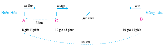 Biên Hòa cách Vũng Tàu 100km. Lúc 8 giờ sáng một ô tô đi từ Biên Hòa đến Vũng Tàu với vận tốc 50km/giờ. Tới Vũng Tàu, xe nghỉ 45 phút rồi quay trở về biên hòa. Lúc 8 giờ 15 phút, một chiếc xe đạp đi từ Biên Hòa đến Vũng Tàu với vận tốc 10km/giờ. Hỏi:
