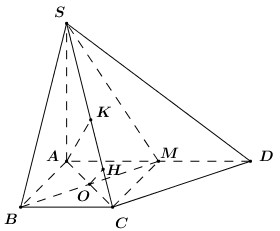 Cho hình chóp \(S.ABCD\) có đáy \(ABCD\) là hình thang vuông tại A và B. Biết \(AD = 2a,\) \(AB = BC = a\) và SA vuông góc với mặt đáy \(\left( {ABCD} \right)\), \(SA = a\sqrt 2 \). Gọi \(M\) là trung điểm \(AD\). Khoảng cách giữa hai đường thẳng \(BM\) và \(SC\) bằng: