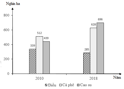 Theo biểu đồ, nhận xét nào sau đây đúng về diện tích cho sản phẩm của một số cây công nghiệp lâu năm nước ta năm 2018 so với năm 2010?