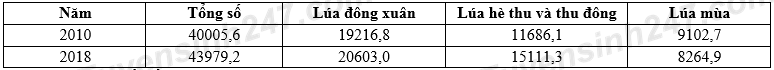 Cho bảng số liệu SẢN LƯỢNG LÚA PHÂN THEO MÙA VỤ CỦA NƯỚC TA NĂM 2010 VÀ NĂM 2018 Theo bảng