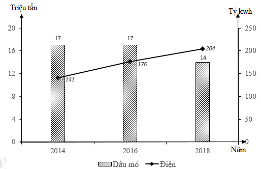 Cho biểu đồ về dầu mỏ và điện của nước ta giai đoạn 2014 – 2018: (Số liệu theo Niên