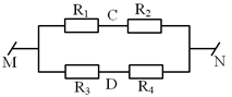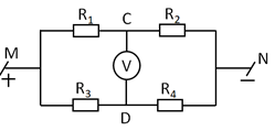 Cho mạch điện như hình vẽ. Các điện trở \({R_1} = {R_2} = 5\Omega ;\,\,{R_3} = 7\Omega ;\,\,{R_4} = 8\Omega \). Tính điện trở RMN của mạch, biết điện trở của Vôn kế là vô cùng lớn.