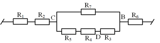 Cho mạch điện như hình vẽ. Các điện trở \({R_1} = {R_3} = {R_4} = {R_5} = {R_7} = R = 4\Omega ;\,\,{R_2}