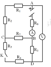 Cho mạch điện như hình vẽ. Các điện trở \({R_1} = {R_3} = {R_4} = {R_5} = {R_7} = R = 4\Omega ;\,\,{R_2} = 5\Omega ;\,\,{R_6} = 2\Omega \). Vôn kế có điện trở rất lớn, Ampe kế có điện trở không đáng kể. Tính điện trở tương đương của mạch khi K đóng, K mở.