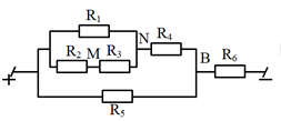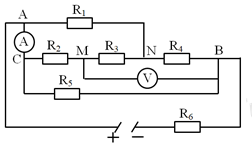 Cho mạch điện như hình vẽ. Các điện trở \({R_1} = 10\Omega ;\,\,{R_2} = {R_4} = 3\Omega ;\,\,{R_3} = 7\Omega ;\,\,{R_5} = \,{R_6} = 8\Omega \). Vôn kế có điện trở rất lớn, Ampe kế có điện trở không đáng kể. Tính điện trở tương đương của mạch.