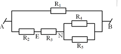 Cho mạch điện như hình vẽ. Biết \({R_1} = {R_5} = 6\,\,\Omega ;\,\,{R_2} = {R_4} = 3\,\,\Omega ;\,\,{R_3} =