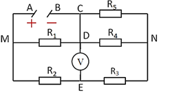 Cho mạch điện như hình vẽ. Biết \({R_1} = {R_5} = 6\,\,\Omega ;\,\,{R_2} = {R_4} = 3\,\,\Omega ;\,\,{R_3} = 2\,\,\Omega \). Vôn kế có điện trở vô cùng lớn. Tính \({R_{AB}}\).
