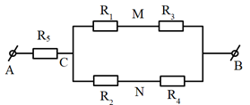 Cho mạch điện như hình vẽ. Biết \({R_1} = {R_2} = 10\,\,\Omega ;\,\,{R_3} = {R_4} = 15\,\,\Omega ;\,\,{R_5}
