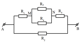 Cho mạch điện như hình vẽ. Biết \({R_1} = {R_2} = 8\,\,\Omega ;\,\,{R_3} = 6\,\,\,\Omega ;\,\,{R_4} = {R_5} = 12\,\,\Omega \). Tính điện trở tương đương của mạch điện