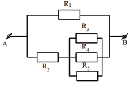 Cho mạch điện như hình vẽ. Biết \({R_1} = {R_5} = 6\,\,\Omega ;\,\,{R_2} = {R_4} = 3\,\,\Omega ;\,\,{R_3} = 2\,\,\Omega \). Tính điện trở tương đương của mạch điện