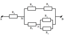 Cho mạch điện như hình vẽ. Biết \({R_0} = 5\,\,\Omega ;\,\,{R_1} = 6\,\,\Omega ;\,\,{R_2} = 18\,\,\Omega ;\,\,{R_3} = {R_5} = 9\,\,\Omega ;\,\,{R_4} = 3\,\,\Omega \). Tính điện trở tương đương của mạch điện