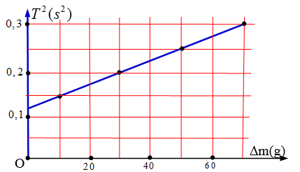\(T = 2\pi \sqrt {\frac{{m + \Delta m}}{k}} \Rightarrow \Delta m = \frac{{{T^2}.k}}{{4{\pi ^2}}} - m\)