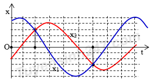 Hai vật A và B dao động điều hòa cùng tần số. Hình bên là đồ thị biểu diễn sự phụ thuộc của li độ x1 của A và li độ x2 của B theo thời gian t. Hai dao động của A và B lệch pha nhau: