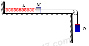 Cho hệ vật gồm lò xo nhẹ có độ cứng k = 10(N/m), vật M có khối lượng 20(g) được nối với vật N có khối lượng 70(g) bằng một sợi dây không dãn vắt qua ròng rọc như hình bên. Bỏ qua mọi ma sát, bỏ qua khối lượng dây và ròng rọc. Ban đầu giữ M tại vị trí để lò xo không biến dạng, N ở xa mặt đất. Thả nhẹ M để cả hai vật cùng chuyển động, sau 0,2(s) thì dây bị đứt. Sau khi dây đứt, M dao động điều hòa trên mặt phẳng nằm ngang với biên độ A. Lấy \(g = 10\left( {m/{s^2}} \right)\,\,\,({\pi ^2} \approx 10).\) Giá trị của A bằng
