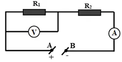 Cho mạch điện có sơ đồ như hình vẽ, trong đó điện trở \({R_1} = 15\Omega ,{R_2} = 5\Omega \), vôn kế chỉ \(3V.\)