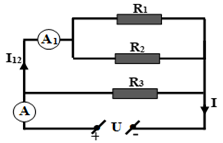 Một đoạn mạch gồm ba điện trở \({R_1} = 9\Omega ,{R_2} = 18\Omega ,{R_3} = 24\Omega \) được mắc vào hiệu điện thế \(U = 3,6V\) như sơ đồ hình vẽ. Số chỉ \(I\) của ampe kế \(A\) và số chỉ \({I_{12}}\) của ampe kế \({A_1}\) lần lượt là: