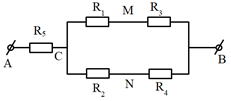 Cho mạch điện như hình vẽ. Biết các điện trở \({R_1} = {R_2} = 10\,\,\Omega ;\,\,{R_3} = {R_4} =
