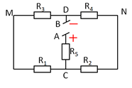 Cho mạch điện như hình vẽ. Biết các điện trở \({R_1} = {R_2} = 10\,\,\Omega ;\,\,{R_3} = {R_4} = 15\,\,\Omega ;\,\,{R_5} = 7,5\,\,\Omega ;\,\,U = 10V\). Tính cường độ dòng điện đi qua điện trở \({R_5}\)