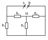 Cho mạch điện như hình vẽ. Biết \({R_1} = {R_3} = 18\,\,\Omega ;\,\,{R_2} = 27\,\,\Omega ;\,\,{R_4} =