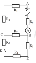 Cho mạch điện như hình vẽ. Các điện trở \({R_1} = {R_3} = {R_4} = {R_5} = {R_7} = R = 4\Omega ;\,\,{R_2} = 5\Omega ;\,\,{R_6} = 2\Omega \), Ampe kế có điện trở không đáng kể. Xác định số chỉ Ampe kế khi K mở, biết \({U_{AB}} = 12V\)