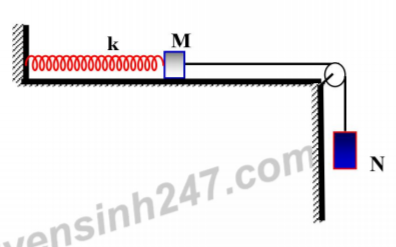 Cho hệ vật gồm lò xo nhẹ có độ cứng k = 20N/m, vật M có khối lượng 36g được nối với vật N có khối lượng 144g bằng một sợi dây không dãn vắt qua ròng rọc như hình bên. Bỏ qua mọi ma sát, Bỏ qua khối lượng dây và ròng rọc. Ban đầu giữ M tại vị trí để lò xo không biến dạng, N ở xa mặt đất. Thả nhẹ M để cả 2 vật cùng chuyển động, sau 0,2s thì dây bị đứt. Sau khi dây đứt, M dao động điều hòa trên mặt phẳng nằm ngang với biên độ A. Lấy \(g = 10{\rm{ }}m/{s^2}\,\left( {{\pi ^2} = 10} \right)\). Giá trị của A bằng:
