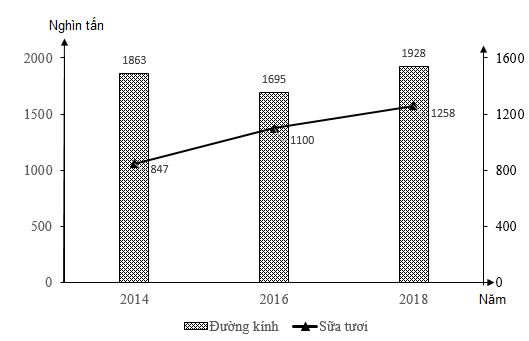 Cho biểu đồ về đường kính và sữa tươi của nước ta giai đoạn 2014-2018: Biểu đồ thể