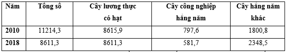 Cho bảng số liệu: DIỆN TÍCH CÁC LOẠI CÂY HÀNG NĂM CỦA NƯỚC TA NĂM 2010 VÀ NĂM 2018 (Đơn vị: