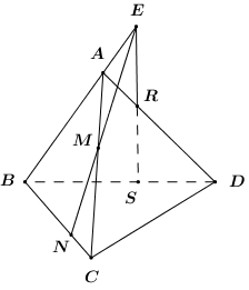 Cho tứ diện \(ABCD\). Mặt phẳng \(\left( \alpha \right)\) không song song \(AB\) cắt \(AC,\,\,BC,\,\,AD,\,\,BD\) lần lượt tại \(M,\,\,N,\,\,R,\,\,S\). Chứng minh \(AB,\,\,MN,\,\,RS\) đồng quy.