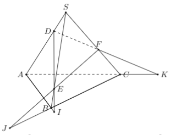 Cho tứ diện \(SABC\). Trên \(SA,\,\,SB\) và \(SC\) lấy các điểm \(D,\,\,E\) và \(F\) sao cho \(DE\) cắt \(AB\) tại \(I\), \(EF\) cắt \(BC\) tại \(J\), \(FD\) cắt \(CA\) tại \(K\). Chứng minh \(I,\,\,J,\,\,K\) thẳng hàng.