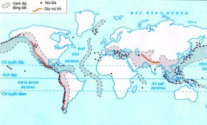 Hình 2. Các vành đai động đất, núi lửa và các vùng núi trẻ