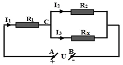 Điện trở tương đương của đoạn mạch \(AB\) có sơ đồ như trên hình vẽ là \(R_{AB} = 10\Omega ,\) trong đó các điện trở \(R_{1} = 7\Omega ;\,R_2 = 12\Omega .\) Hỏi điện trở \(R_x\) có giá trị nào dưới đây?