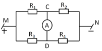 Cho mạch điện như hình vẽ. Biết \({R_1} = {R_3} = 8\,\,\Omega ;\,\,{R_2} = {R_4} = 10\,\,\Omega ,U = 18V\). Cho điện trở của ampe kế không đáng kể. Xác định số chỉ của Ampe kế.