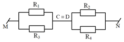 Cho mạch điện như hình vẽ. Biết \({R_1} = {R_3} = 8\,\,\Omega ;\,\,{R_2} = {R_4} = 10\,\,\Omega ,U = 18V\).