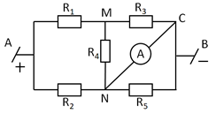 Cho mạch điện như hình vẽ. Biết \({R_1} = {R_3} = 3\,\,\Omega ;\,\,{R_2} = 5\,\,\Omega ;\,\,{R_4} =