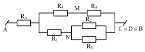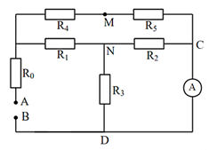 Cho mạch điện như hình vẽ. Biết \({R_0} = 0,5\Omega ;{R_1} = 5\Omega ;{R_2} = 30\Omega ;\) \({R_3} = 15\Omega ;{R_4} = 3\Omega ;{R_5} = 12\Omega ;U = 48V\). Điện trở của Ampe kế không đáng kể. Tìm số chỉ của Ampe kế?