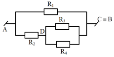 Cho mạch điện như hình vẽ. Biết \(U = 90V;{R_1} = 45\Omega ;{R_2} = 90\Omega ;{R_4} = 15\Omega \). Bỏ qua