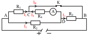 Cho mạch điện như hình vẽ. Biết \(U = 90V;{R_1} = 45\Omega ;{R_2} = 90\Omega ;{R_4} = 15\Omega \). Bỏ qua điện trở của Ampe kế và của khóa K. Khi K mở hoặc K đóng thì số chỉ của Ampe kế không đổi. Tính cường độ dòng điện qua khóa K khi K đóng.