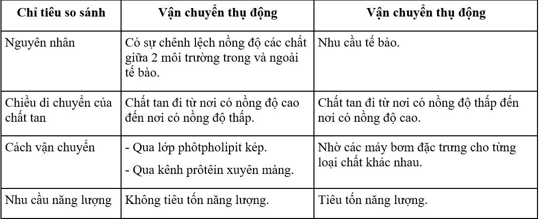 So sánh vận chuyển thụ động với vận chuyển chủ động