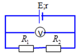 Cho mạch điện như hình bên với \(E = 18V\,;\,r = 2\Omega \,;\,R_1 = 15\Omega \,;\,R_2 = 10\Omega \) và \(V\)
