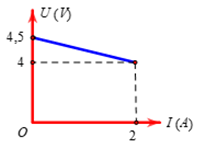 Người ta mắc hai cực nguồn điện không đổi với một biến trở. Điều chỉnh biến trở, đo hiệu điện thế \(U\) giữa hai cực của nguồn và dòng điện \(I\) chạy qua mạch ta vẽ lược đồ thị như hình vẽ. Xác định suất điện động và điện trở trong của nguồn.